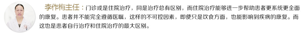 门诊后回家自行用药和住院治疗,同样是治疗,可效果却差别很大,这主要体现在康复的时间、愈后的效果以及白癜风的反复性。诊断后在家治疗,患者常常不能完全遵医嘱,这样就存在很多不可控的因素,如饮食方面、作息时间、用药的习惯等,都在不知不觉间影响着白癜风的康复。而住院治疗是在住院部医护人员的监护下,患者能够很好的避免这些不利因素,同时住院部医师可以监控患者病情,根据需要及时调整方案,不用等到患者来院复查,这都能够进一步帮助患者更系统更全面的康复。