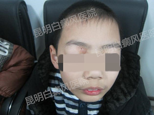 (2013年5月6日,初诊时,眼周白斑明显,色素脱失严重,边缘模糊,白斑处于进展期)