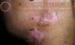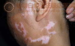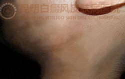 病 史:患者3年前左面部出现几粒白点,未曾就诊,一年后发现扩散现象,经地方医院治疗一段时间后,不见好转。今来到我院治疗。