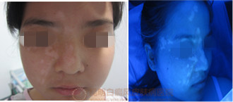 4、Wood灯:灯下见面部白斑边缘模糊不清,色素脱失严重
