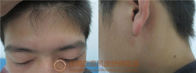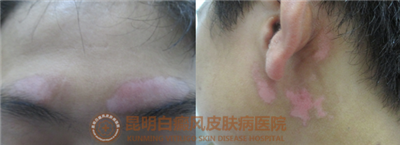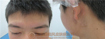 初诊时,患者面部及耳后白斑清晰可见,色素脱失较严重。在邻居的介绍下得知昆明白癜风皮肤病医院是治疗白癜风的专科医院,治疗效果很不错,因此便直接来院治疗。
