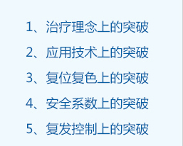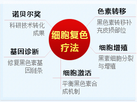 细胞复色疗法作为国家"十二五规划"重点医学项目,该项目以"黑色素修复——合成——再生——复色"为新医学理论突破口,并依据"治其外必治其内"、"治其内必治其根"的辨证施治理论,从生物细胞学、分子免疫学入手,系统地分析了白癜风的病因、病机及治疗方法。