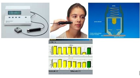 基于光谱吸收的原理(RGB),通过测定特定波长的光照在人体皮肤上后的反射量来确定皮肤中黑色素的含量。仪器探头的发射器发出波长分别为568nm、660nm、和880nm三种波长的光照射在皮肤表面,接受器测得皮肤反射的光。由于发射光的量是一定的,因此就可以测出被皮肤吸收的光的量,测出皮肤黑色素的含量。