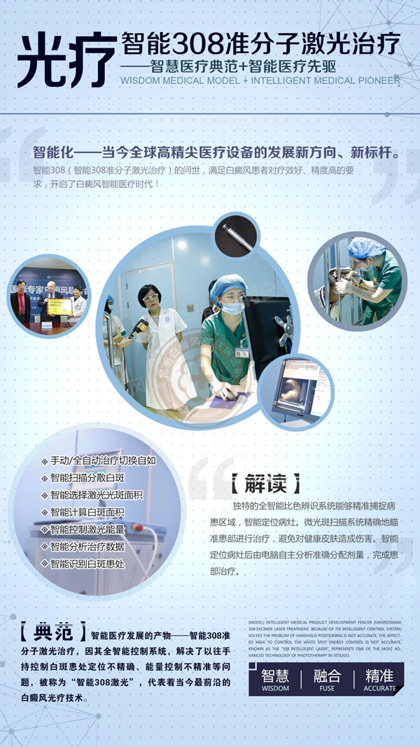 “很多患者白斑面积大,需要手术治疗,但又很多都不适合手术,智能308的出现,让很多患者有了更多的选择,让很多发展期病情的患者进入稳定期,让手术治疗更加便捷化。”——北京协和医院刘志飞教授
